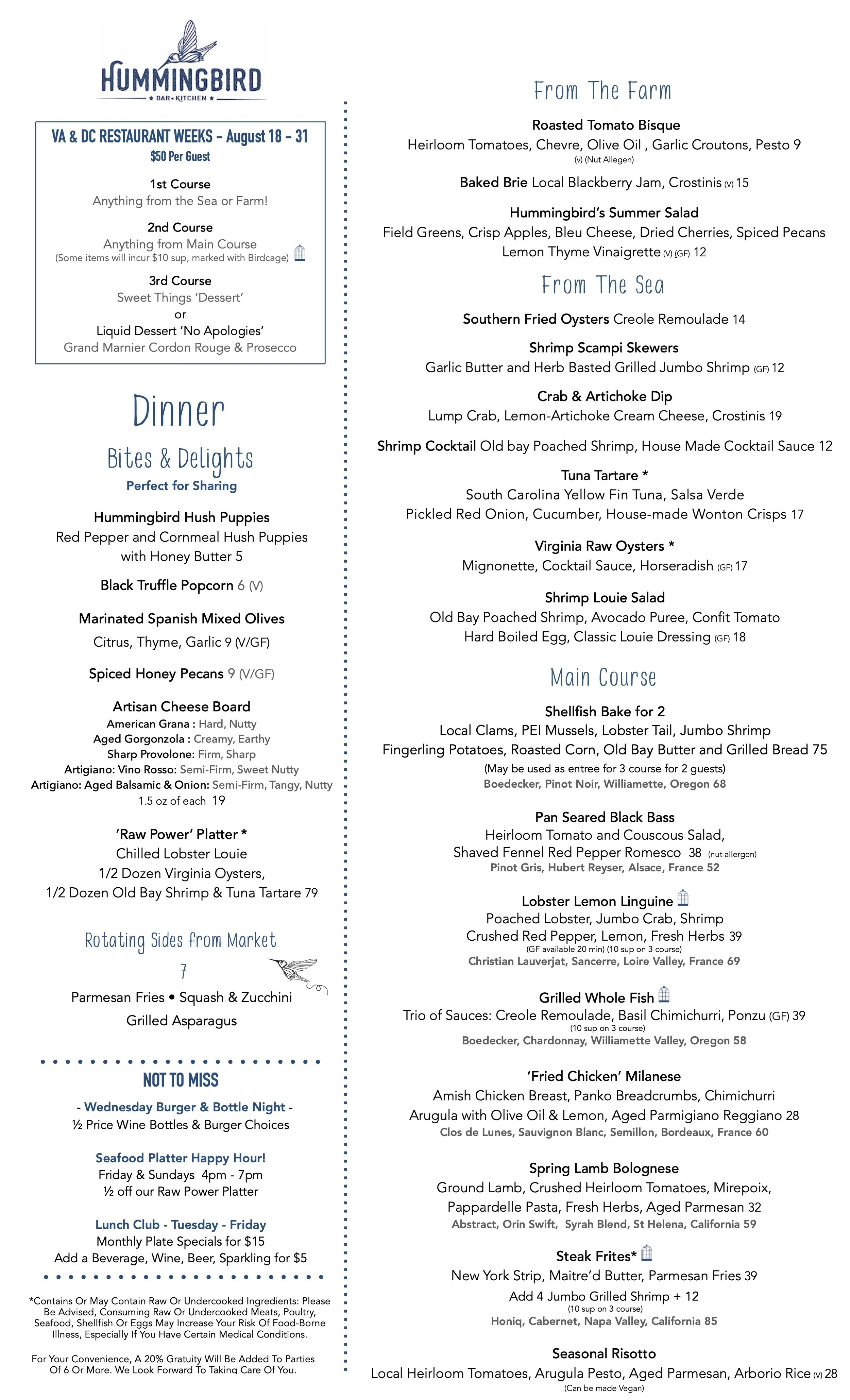 Summer Restaurant Week on the waterfront. Hummingbird showcases delightful Seafood dishes from Seafood Bakes, Shrimp Louie and Lobster Linguini. Hummingbird Restaurant is the perfect place to savor the taste of the ocean in a charming and vibrant setting.